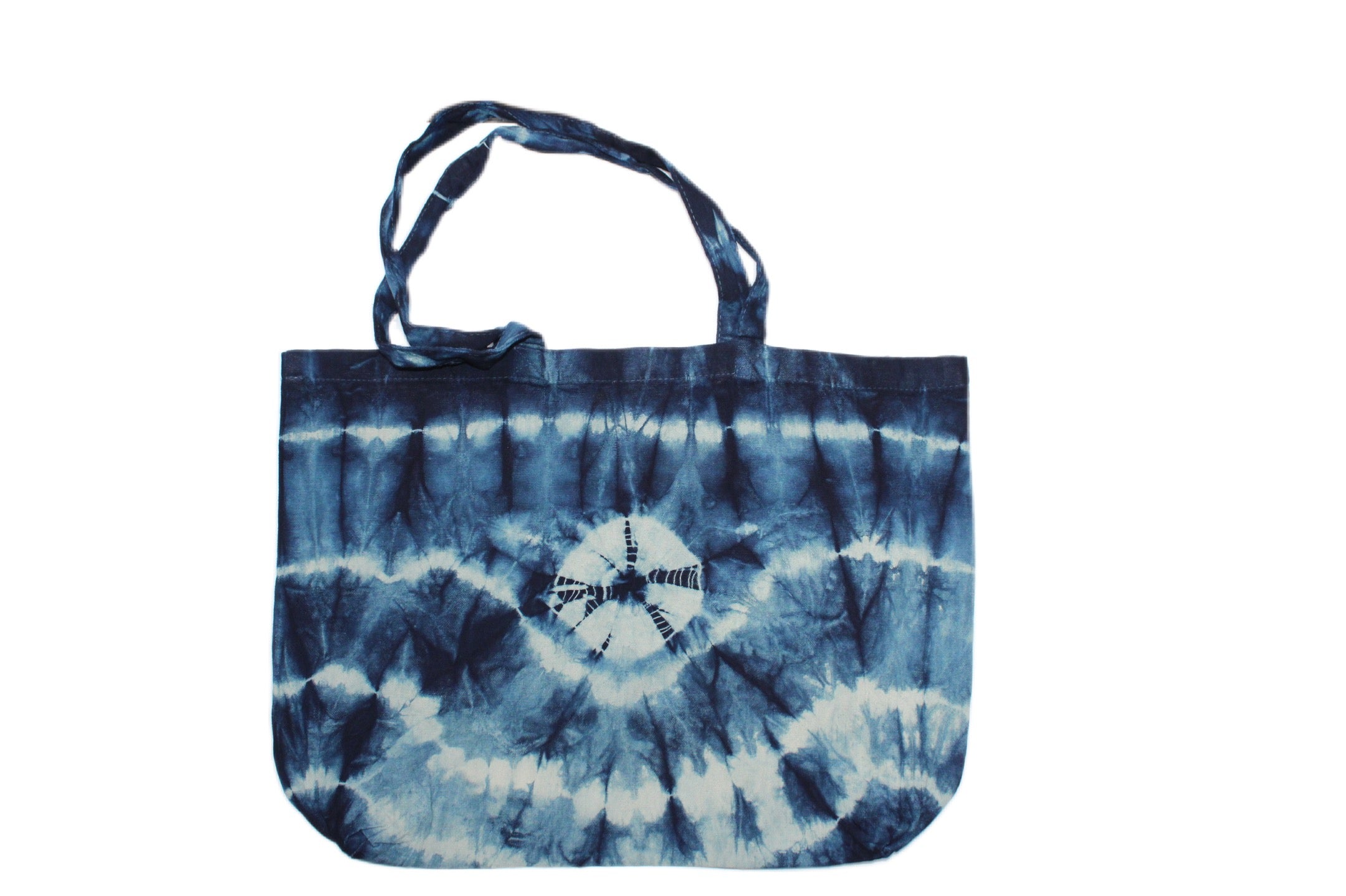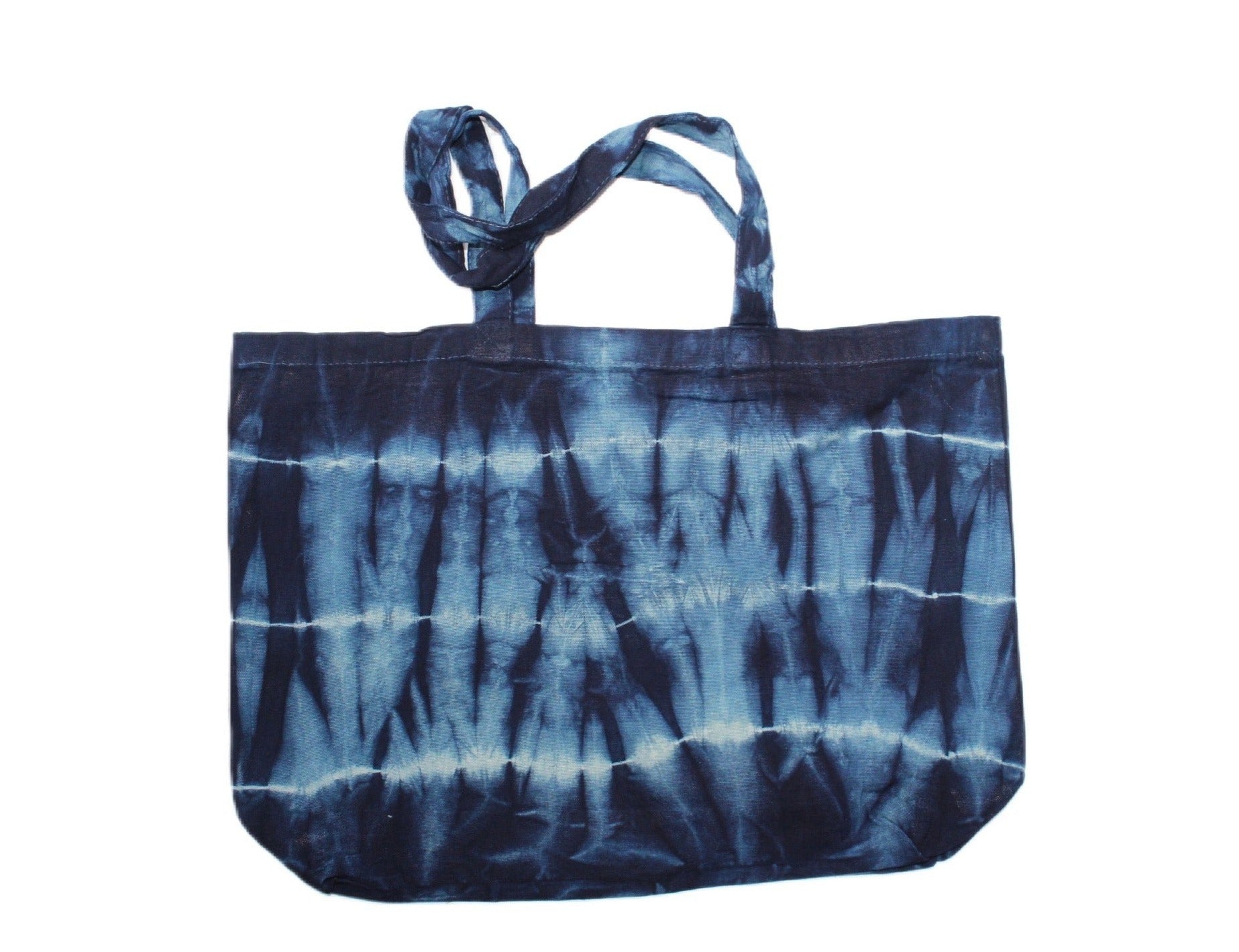 another version of the sunshine design, this medium weight denim tote is dyed with natural indigo at Kofar Mata Dye pits in Kano, Nigeria- the oldest indigo dye pits in Africa